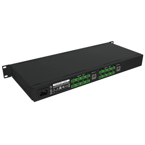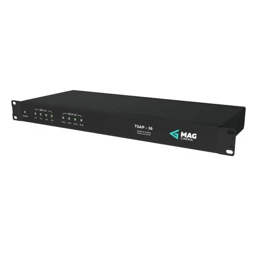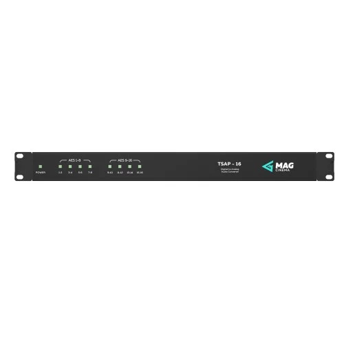 TSAP-16 is a 16-channel digital-to-analog convertor, which gives possibility to connect cinema processor with only analog inputs to digital cinema server output or to use internal processor of the server. Up to 8 AES/EBU digital audio inputs are accepted through RJ-45 socket. Output is served via easily accessed Phoenix sockets.