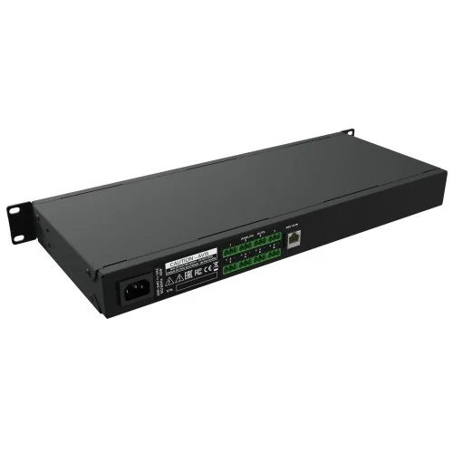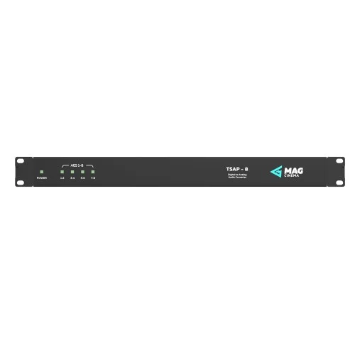 TSAP-8 is an 8-channel digital-to-analog convertor, which gives possibility to connect cinema processor with only analog inputs to digital cinema server output or to use internal processor of the server. Up to 4 AES/EBU digital audio inputs are accepted through RJ-45 socket. Output is served via easily accessed Phoenix sockets.